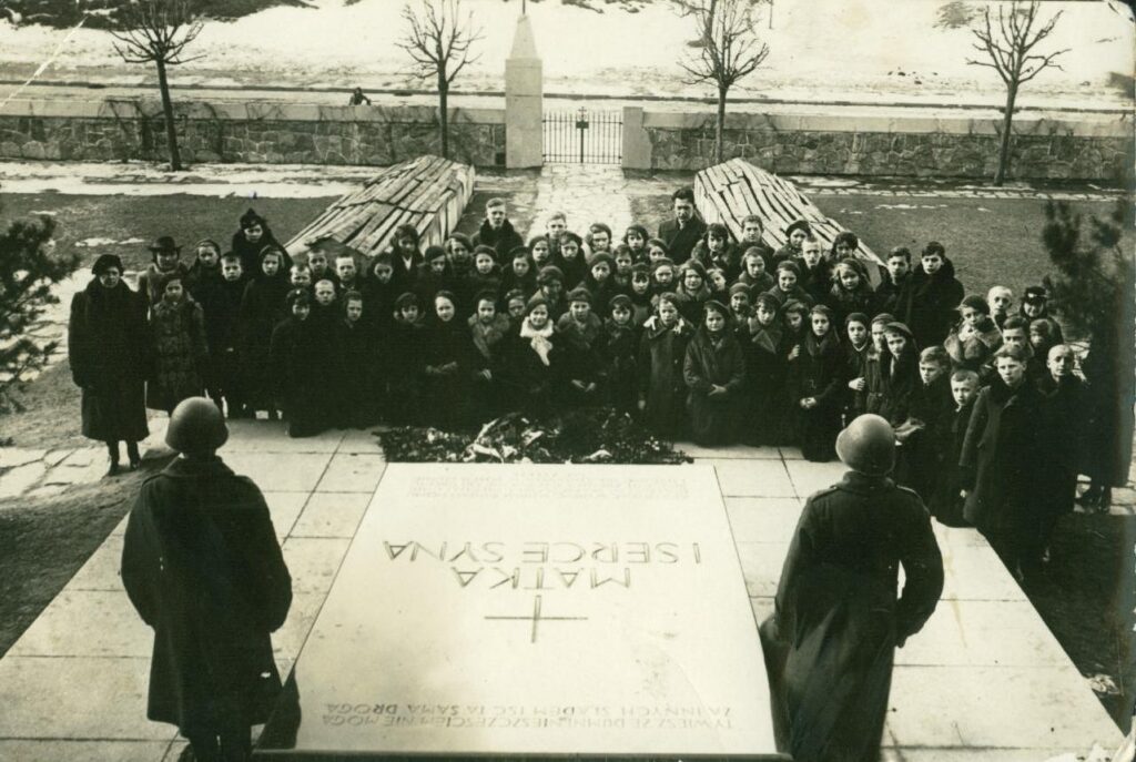 Uczniowie Szkoły Podstawowej nr 2 w Łapach na cmentarzu na wileńskiej Rossie. Fotografia przedstawia uczestników wycieczki zgromadzonych przy grobie, gdzie spoczywa Maria z Billewiczów Piłsudska oraz serce jej syna – Marszałka Józefa Piłsudskiego. Pierwsza z lewej strony stoi dyrektor Sabina Grindel z córką Marią (po ślubie nosząca nazwisko Maliszewska). Jako pierwszy z prawej strony – Mieczysław Łapiński. Zdjęcie wykonano około 1936 roku.