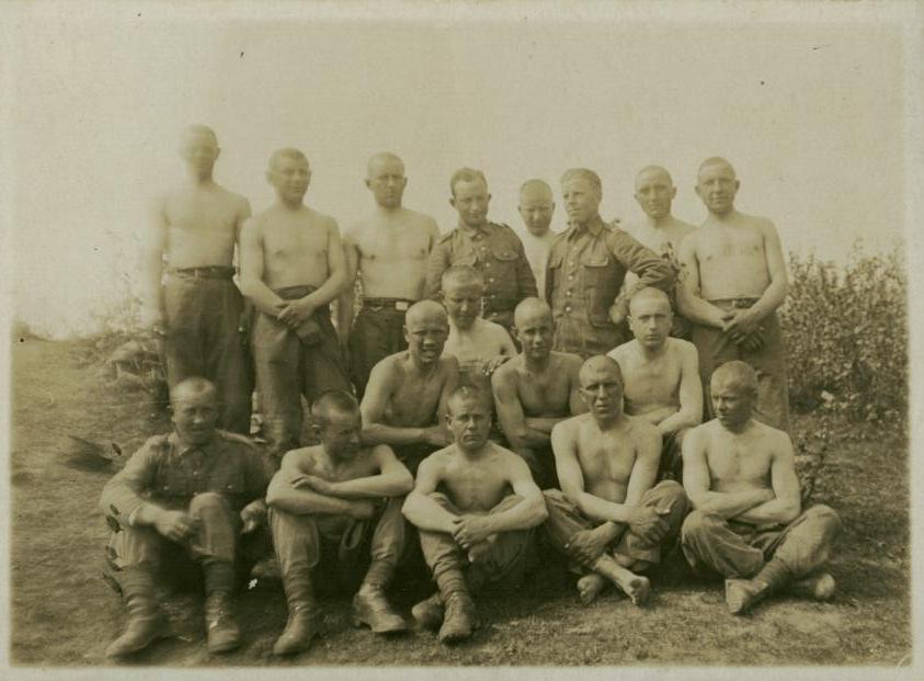 Rekruci w pierwszym tygodniu służby. Drugi z lewej strony w drugim rzędzie klęczy Zygmunt Perkowski.