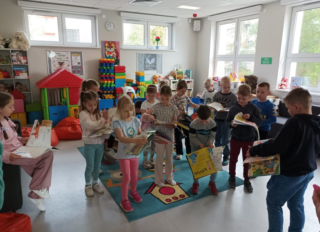 Na zakończenie gościliśmy 6-latki z grupy „Muminki” z przedszkola „Dwójeczka”, które uczestniczyły w warsztatach „Zabawa z książką”. Było czytanie, taniec, zagadki i twórczość plastyczna – a wszystko z książką w roli głównej!