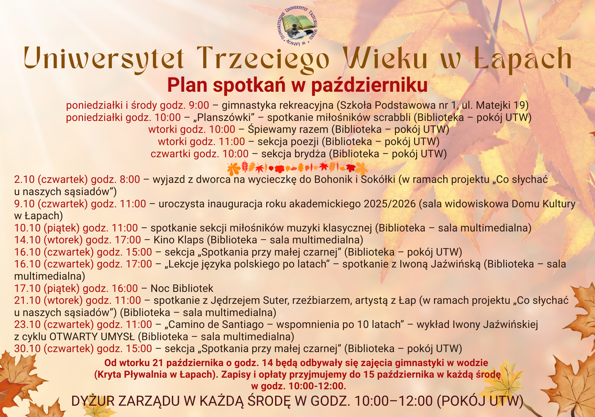 Plan spotkań słuchaczy Uniwersytetu Trzeciego Wieku w październiku Hanna Nikin 26/09/2025 Uniwersystet III Wieku Nawigacja wpisu Poprzedni Poprzedni wpis: Senior i nowoczesne technologie – kurs z kompetencji cyfrowych rozpoczętyNastępny Następny wpis: Informacja o biletach na spektakl operowy