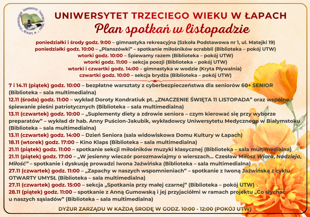 Plan spotkań słuchaczy Uniwersytetu Trzeciego Wieku w listopadzie Hanna Nikin 29/10/2025 Uniwersystet III Wieku Nawigacja wpisu Poprzedni Poprzedni wpis: Spotkanie autorskie z Grażyną BąkiewiczNastępny Następny wpis: Zmiana godzin pracy biblioteki