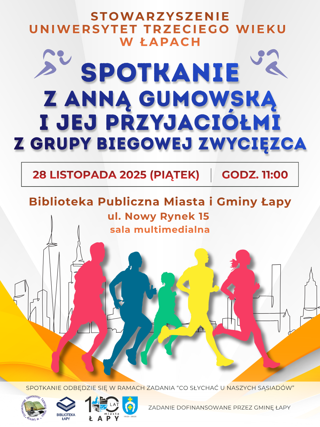 Zapraszamy na spotkanie z Anną Gumowską i jej przyjaciółmi z Grupy Biegowej Zwycięzca Hanna Nikin 15/11/2025 Uniwersystet III Wieku Zadanie „Co słychać u naszych sąsiadów” zostało dofinansowane przez Gminę Łapy. Nawigacja wpisu Poprzedni Poprzedni wpis: Wykład dr hab. Anny Puścion-Jakubik pt. „Suplementy diety a zdrowie seniora – czym kierować się przy wyborze preparatów”Następny Następny wpis: Baśniowy poranek