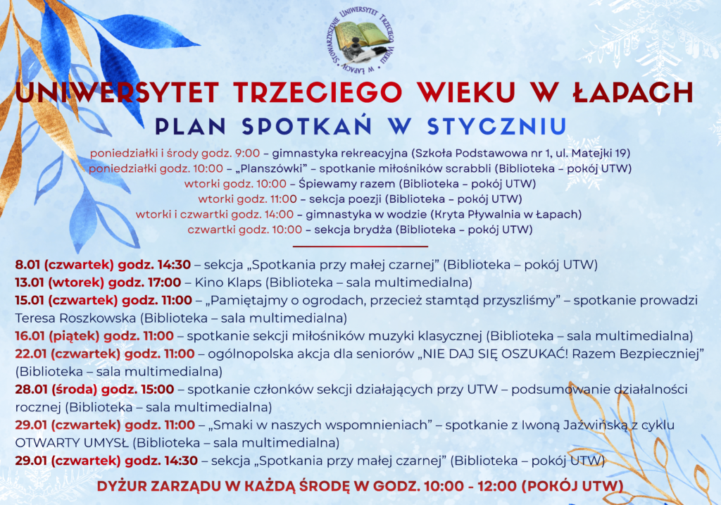 Plan spotkań słuchaczy Uniwersytetu Trzeciego Wieku w styczniu Hanna Nikin 30/12/2025 Uniwersystet III Wieku Nawigacja wpisu Poprzedni Poprzedni wpis: Jelena Czyżowa – Czas kobiet