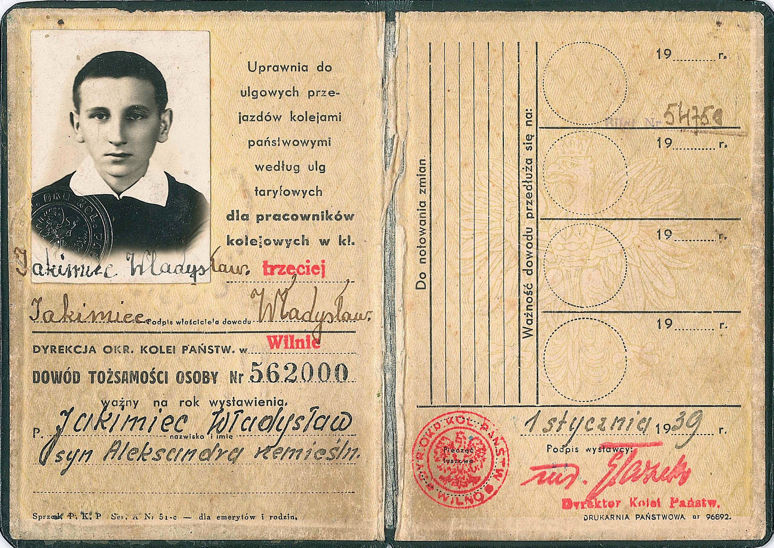 Dowód tożsamości PKP wystawiony 1 stycznia 1939 r. przez Dyrekcję Okręgową Kolei Państwowych w Wilnie.