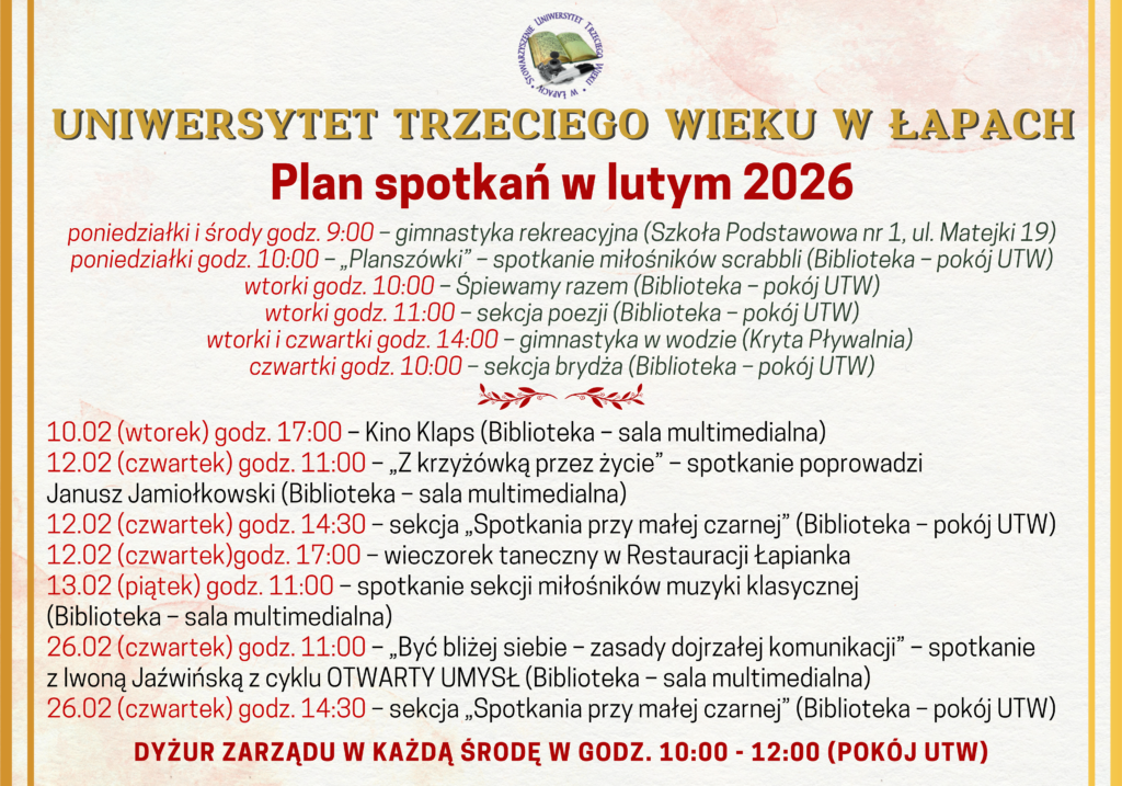 Plan spotkań słuchaczy Uniwersytetu Trzeciego Wieku w lutym Hanna Nikin 29/01/2026 Uniwersystet III Wieku Nawigacja wpisu Poprzedni Poprzedni wpis: Podsumowanie rocznej aktywności sekcji działających w ramach Uniwersytetu Trzeciego Wieku w Łapach