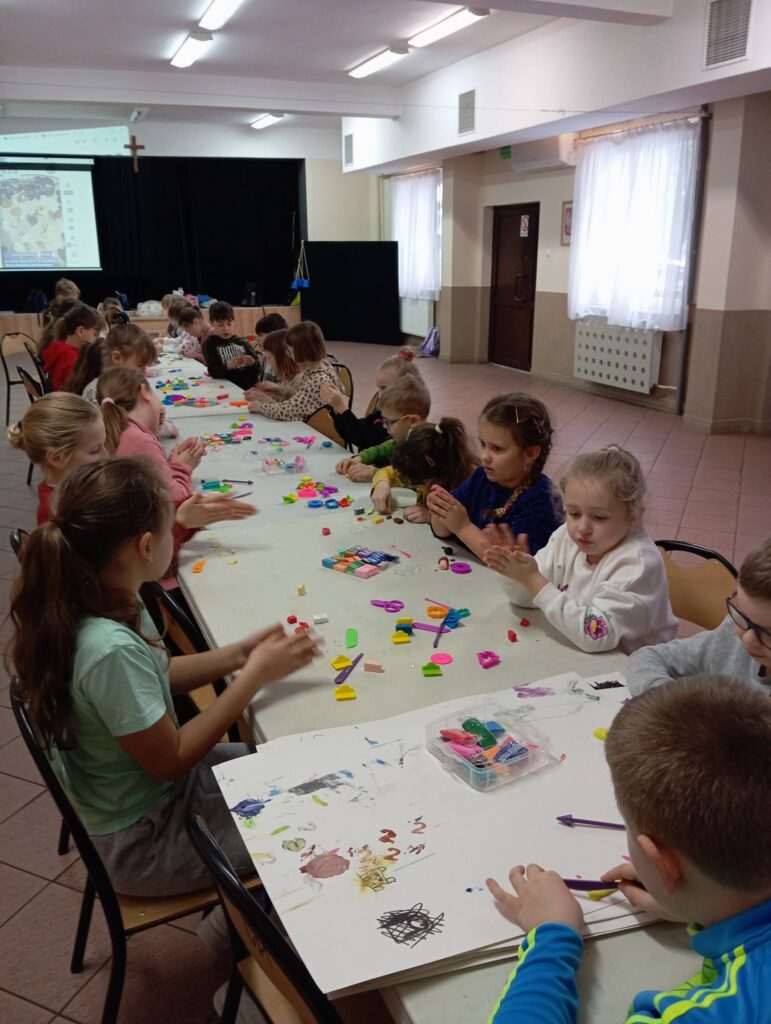 Drugi dzień ferii rozpoczęliśmy animacjami dźwiękowymi z bum bum rurkami, które dostarczyły dzieciom sporo radości. Następnie odwiedził nas Pan Damian z Instytutu Pamięci Narodowej Oddział w Białymstoku. Gość przeprowadził z dziećmi spotkanie pt. „Ferie z IPN – warsztaty edukacyjne Zwierzęca Brygada”. Pan Damian rozpoczął od interesującej prezentacji na temat zwierząt biorących udział w działaniach wojennych – była mowa m.in. o niedźwiedziu Wojtku towarzyszącym żołnierzom armii Andersa, o małpce Betty z ORP „Błyskawica”, o psie Lizandrze, kotce Kici i innych niezwykłych bohaterach. Następnie dzieci mogły sprawdzić, co zapamiętały z wykładu, biorąc udział w przygotowanym quizie. Później wszyscy mieli okazję zagrać w gry planszowe z serii „Zwierzęca Brygada”. Ostatnim punktem spotkania były wspaniałe kolorowanki oraz drobne upominki od naszego gościa, które sprawiły dzieciom wiele radości. Po warsztatach dzieci bawiły się ruchowo z piłkami i piankami, rozładowując energię.