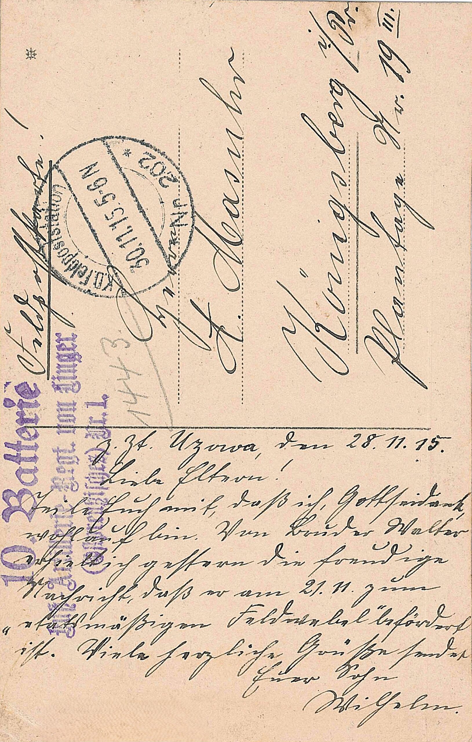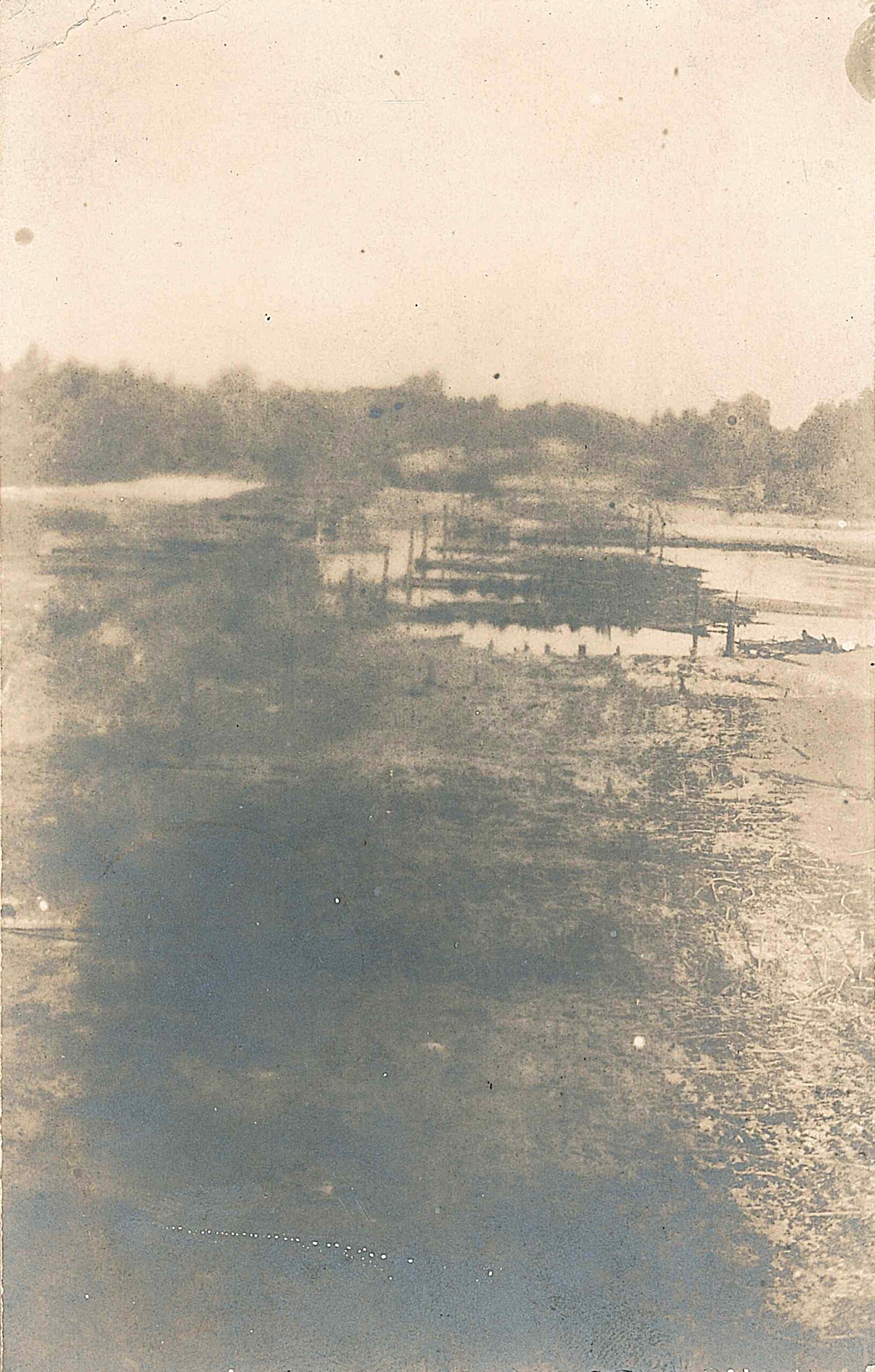 Fotograficzna pocztówka przedstawiająca zniszczoną przeprawę przez rzekę Narew w okolicach Uhowa. Pocztówka została wysłana z Uhowa do Królewca za pośrednictwem niemieckiej poczty polowej. W prawym górnym rogu znajduje się okrągła pieczątka z napisem „K.D. Feldpoststation Nr 202”. Tekst pocztówki sporządzono w języku niemieckim. Data korespondencji: 30 listopada 1915 r.